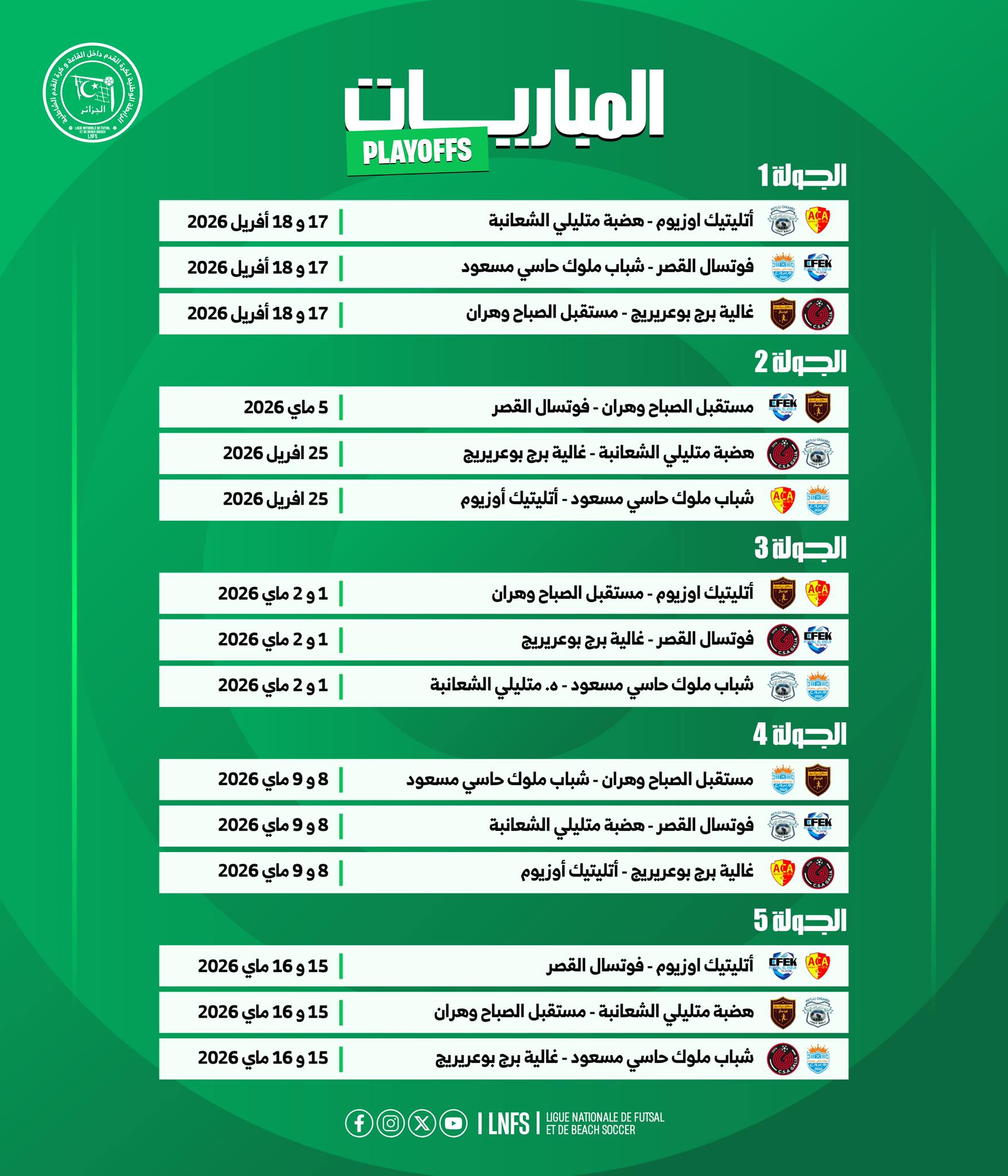 بناء على قرار قسم التنظيم الرياضي و المنافسات الصادر بالمحضر رقم 037 لجلسة الاثنين 06 أفريل 2026. حددت قائمة الفرق المتأهلة الى دورة اللقب لبطولة القسم الوطني الأول (رجال) على النحو الاتي