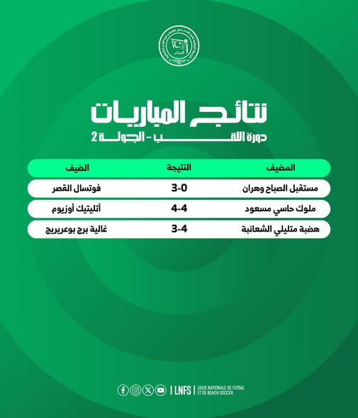 كانت نتائج مباريات الأسبوع الثاني من الدور الثاني لدى منافسات الأكابر على النحو الاتي
